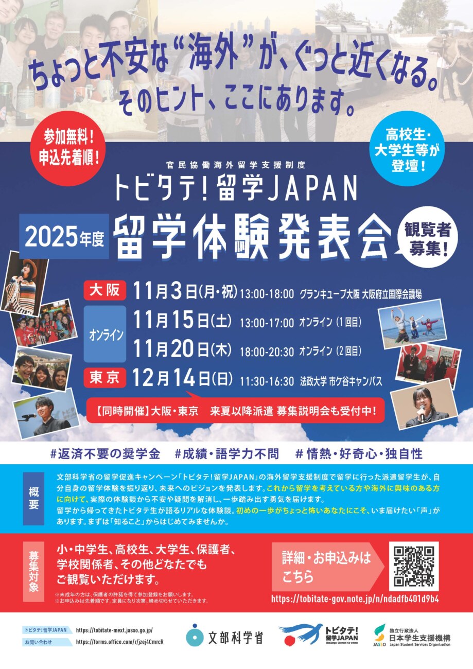 日本学生支援機構(JASSO)のイベント案内・トビタテ留学JAPAN!に関する情報です。