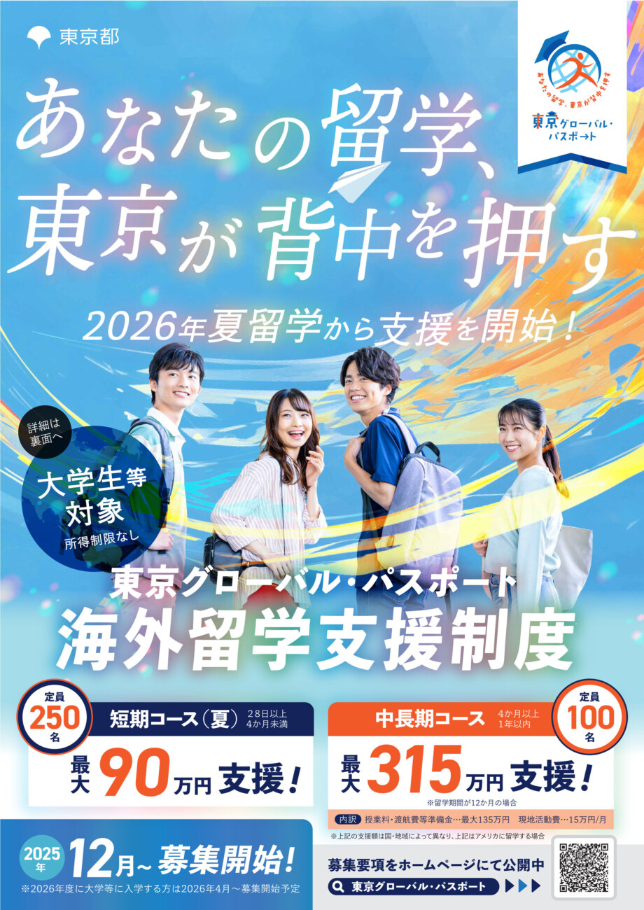 - 東京都が実施する海外留学支援制度「東京グローバル・パスポート」では、2026年度の短期コース(夏留学)および中長期コースにおいて、より多くの学生が海外留学の第一歩を踏み出すきっかけを提供することを目的としています。この制度は、将来のグローバル人材として主体性と挑戦意欲にあふれる大学生等を積極的に支援します。